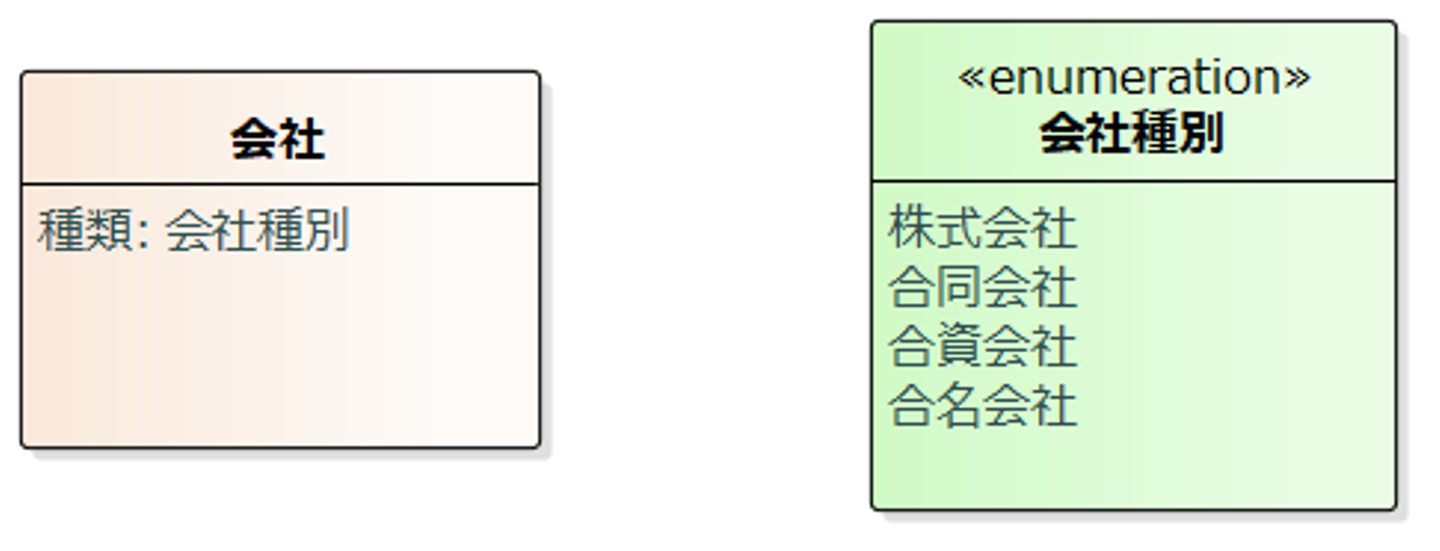 上記の例では、会社種別を列挙体で宣言していますが、下記のようにノートで記載した場合も同じことです。