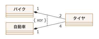 図5 は関連間の{xor}制約を使って表記した例です。この例の場合、あるひとつの「タイヤ」のインスタンスから見て、常に{xor}制約で繋がれている2つの関連線のうちのどちらか片方だけが有効になる...というふうに解釈します。ただし、関連間の{xor}制約は解釈が曖昧になってしまうケースもあるのであまり使わない方が良いのかもしれません。