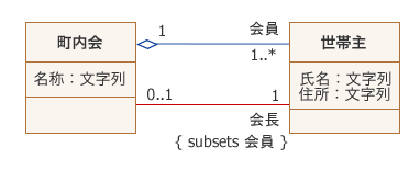 図13 の「会長」側の関連端に追加された「 { subsets 会員 } 」という記述によって、『ある「町内会」のインスタンスから「会長」として参照される「世帯主」のインスタンスは、同じ「町内会」のインスタンスから「会員」として参照されている「世帯主」のインスタンス群の中のいずれかでなければならない』という事が示されています。