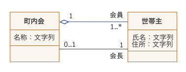 図11 のクラス図は「町内会」と「世帯主」を含む問題領域のモデルの一部です(説明のため2本の関連線を青と赤で色分けして表示しています)。