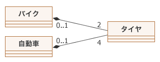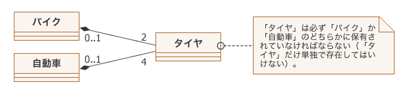 この例では、コンポジションの共有不可制約のため「タイヤ」側から見た「バイク」および「自動車」側の多重度は「0..1」にならなくてはならないのですが、その都合で『「タイヤ」のインスタンスは「バイク」や「自動車」のインスタンスに保有されていなくても(単独で)存在することもできる』という構造になっています。でも、『「タイヤ」のインスタンスがポッとひとつ浮いて存在してしまうような構造は許したくない(「タイヤ」は「バイク」か「自動車」のどちらかに必ず保有されていて欲しい)』という場合はどう表現したら良いでしょうか?