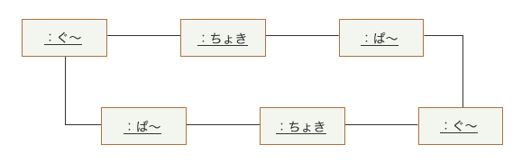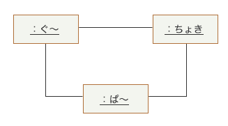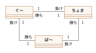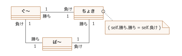 このクラス図に記述されている制約式「 { self.勝ち.勝ち = self.負け } 」を日本語的に記述してみると、『自分(この場合は「ちょき」のあるインスタンス)から「勝ち」という関連端名で辿れるインスタンス(これは「ぐ~」クラスのあるインスタンスになる)から、さらに「勝ち」という関連端名で辿れるインスタンス(これは「ぱ~」クラスのあるインスタンスになる)は、自分から「負け」という関連端名で辿れるインスタンスと同じものでなければならない』といった感じになります。もちろん、この制約式は「ぐ~」や「ぱ~」を起点(self)として記述してもOKです。