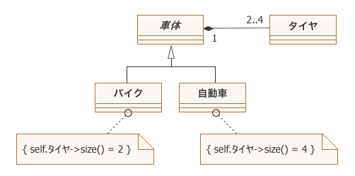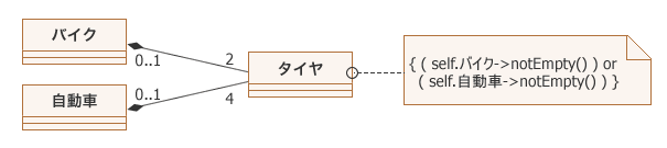 図3 の制約式「 { ( self.バイク->notEmpty() ) or ( self.自動車->notEmpty() ) } 」を日本語的に記述してみると、『自分(この場合は1つの「タイヤ」のインスタンス)から辿れる「バイク」が空でない(相手のインスタンスが存在する)、または、自分から辿れる「自動車」が空でない』といった感じの内容になるでしょう。この条件式だとorの左辺と右辺の両方がtrueになっても良さそうで少し混乱してしまうかもしれません(実際はコンポジションの共有不可制約があるので、左辺と右辺の両方が同時にtrueになることは許されないので問題ありませんが...)。別の記述方法としては 図4 のようなものも考えられます。