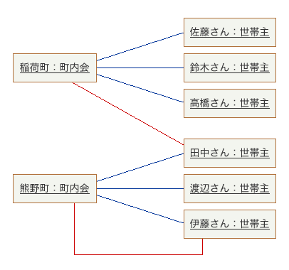 図12 では、「稲荷町:町内会」の会長が「稲荷町:町内会」の会員ではない「田中さん:世帯主」になっています(「田中さん:世帯主」は「熊野町:町内会」の会員)。私達(日本人)は世間一般の常識から無意識のうちに「ある町内会の会員でない人がその町内会の会長役を勤めることはないだろう」という思い込みをしてしまいがちです。そのため、図12 に示したようなインスタンス群の構造もあり得るということ自体、なかなか思いつきにくかったりします(常識が邪魔をする)。