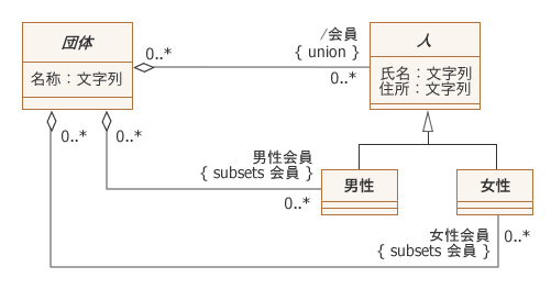 {union}は派生関連端(何か別の情報によって参照先のインスタンス群が派生的に決定される)に付けられるプロパティで、その関連端をsubsetsで参照している他の関連端から辿れるすべてのインスタンス群の和集合となることを示します。たとえば、図14 の例の場合、ある「団体」は「男性会員」と「女性会員」を区別して会員登録しています。ある「団体」から関連端名「会員」で辿れる「人」の集合は、その「団体」の「男性会員」の集合と「女性会員」の集合の和集合となります。このように、複数の他の関連の合成として関連を構成したりしたい場合にunionとsubsetsを組み合わせて使用すると便利です。