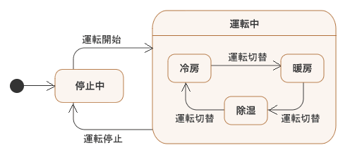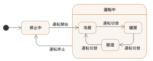 このステートマシン図だと、このエアコンはたとえば以下のような動作をします(適当なシナリオを想定しています)。