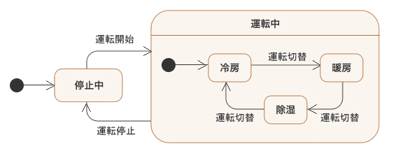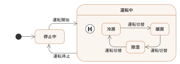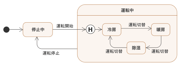 このステートマシン図では、「停止中」状態から「運転開始」イベントが起こると「運転中」状態に遷移しますが、その「運転中」状態の入れ子の「冷房」「暖房」「除湿」のどの状態が現在の状態になるか決定することができません。