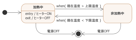 この「保温器」は「温度センサー」から取得した「現在温度」が設定された「上限温度」と「下限温度」の範囲に入るように「ヒーター」のON/OFFを制御するものとします。この「保温器」のステートマシン図(状態遷移図)を考えてみましょう。