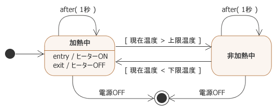このステートマシン図は「加熱中」状態および「非加熱中」状態に「after(1秒)」というトリガーが付けられた自己遷移が追加されていることを除いて 図2 のステートマシン図と同じです。ここで使われている「after(時間)」という記述はUMLで用意されているTimeEventの一種で、この例では現在の状態が「加熱中」状態(または「非加熱中」状態)になった時から1秒後にafterイベントが自動的に発火し、一度現在の状態を抜けてから再度同じ状態に遷移します。つまり、現在の状態が「加熱中」(または「非加熱中」)状態にある間、常に1秒間隔で現在の状態に入りなおしているということです。このようにしておくと、1秒間隔で現在の状態が変わる(入りなおされる)ので、その都度自動遷移(ラムダ遷移)を起こそうとしてガード条件が評価されるようになります。