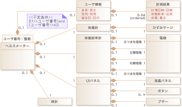 このクラス図では最上位に「ヘルスメーター」というクラスが導入されており、「ヘルスメーター」のインスタンスがそれを構成する部品群を管理しているという考え方をしています(「体重計測部」⇒「体重計」、「体脂肪率計測部」⇒「体脂肪率計」といったクラス名の修正も行われています)。ある構成部品が他の構成部品の機能を利用する必要がある場合、「ヘルスメーター」クラスがそれらのオブジェクト間の仲介をします。このような構造であれば、個々の構成部品間の結合度を下げることができますし、対象となるシステムの基本骨格の理解・整理もしやすくなります。反面、「ヘルスメーター」クラスが仲介役となるので、メッセージの委譲が多くなったり、「ヘルスメーター」クラス内部の処理が若干複雑になってくる場合もあります。
