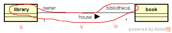 UMLって、言語だって知っていますか? Unified Modeling Language で、 ラングエッジ 、つまり 言語 です。 でも日本人からみると、言語じゃなくて 図ですよね。 まあ、どう見たって、 図 。 これでも、日本人から見たら、やっぱり 図 ですよね。 「図書館は、蔵書を所蔵する。」 でも、これを英語にしてみましょう。 「A Library houses bibliothecas.」 ※house:所蔵する、bibliotheca:蔵書、owner:所有者 なんか、UMLのクラス図の並び