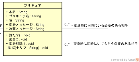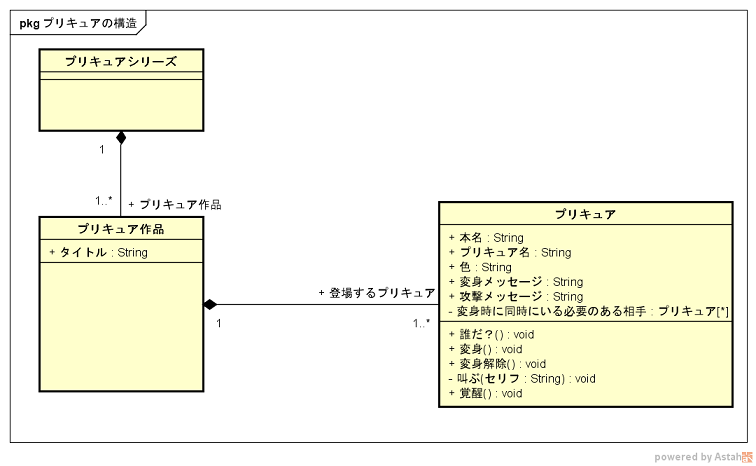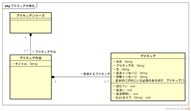 以前から気になってはいたのですが、 プリキュアの各言語での実装まとめ を見て、【UMLでプリキュア】を書くことを決意しました。 仕様は、前出のプリキュア記事からざっくりと拾いました。 以下を静的構造分析します。 プリキュアシリーズとは、複数のプリキュア作品を含みます。 プリキュア作品には、タイトルがあります。 プリキュア作品には、それぞれプリキュアが登場します。 プリキュアには、本名のほかにプリキュアとしての名前があります。 プリキュアには、それぞれのカラー・変身のセリフ・攻撃のセリフがあります。 プリキ