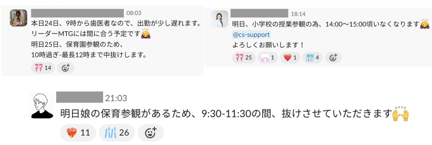 勤怠チャンネルではパパママ社員たちの中抜け報告もチラホラ