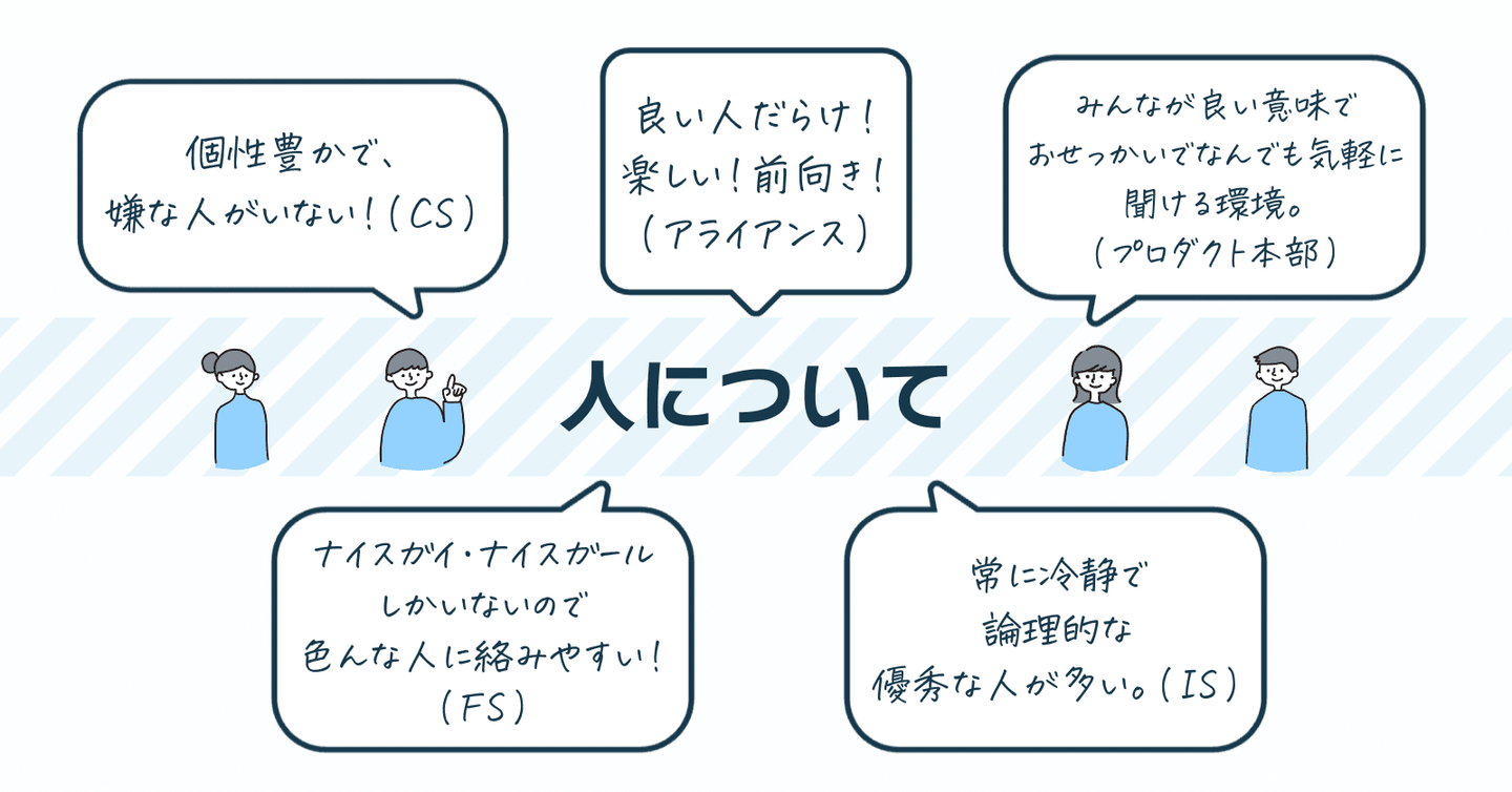 - 部門間や職種間の軋轢がなく、全員が分け隔てなくコミュニケーションを取っている(プロダクト本部)