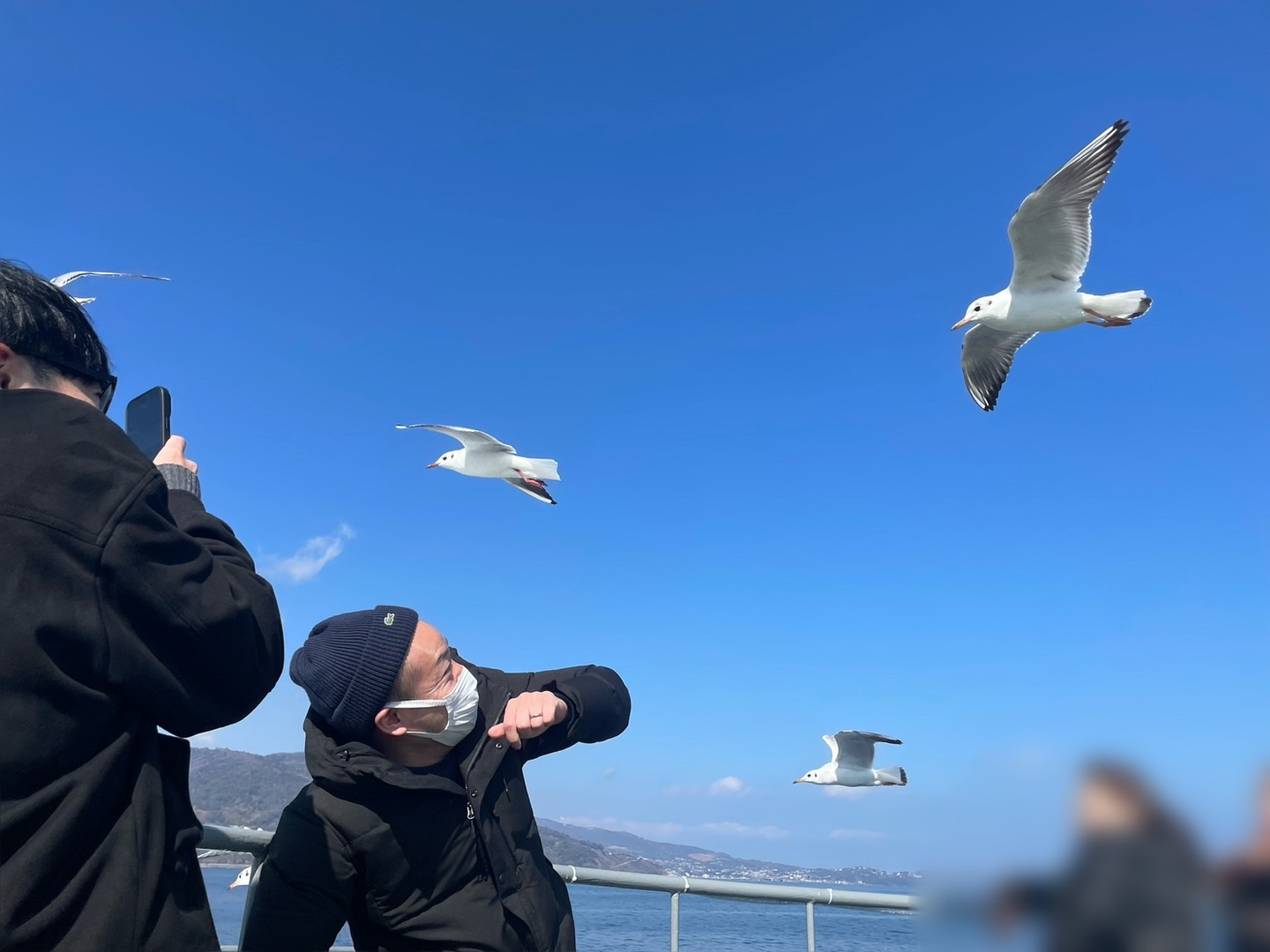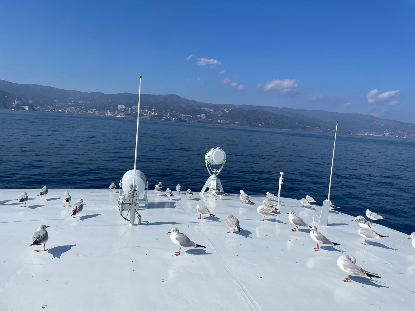 初日の海とは打って変わり、穏やかで晴れ渡る空の下、カモメがたくさん。
