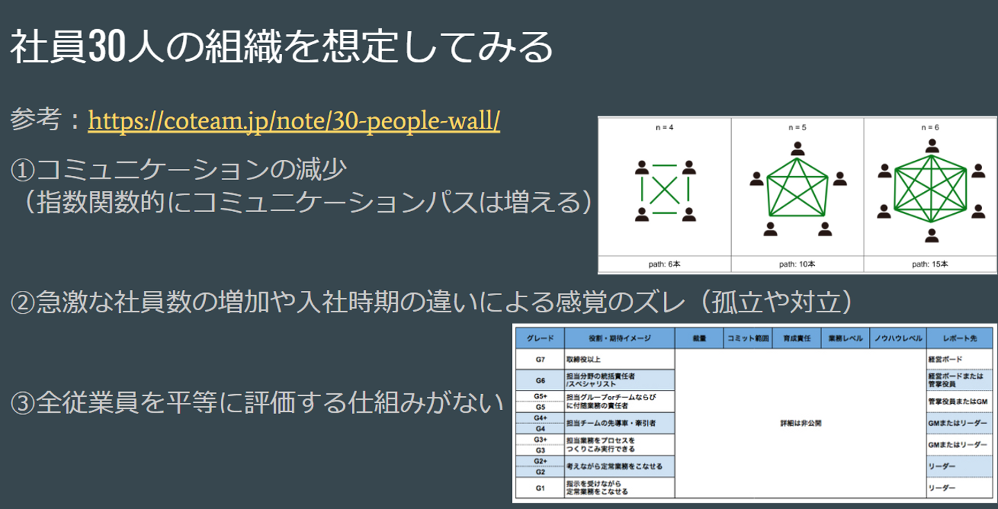 全社10人の組織に、社員が1人増えるごとに、コミュニケーションパスは9増えます。さらに1人増えるとpパスは10増えます。つまり、コミュニケーションパスは指数関数的に増加していきます。何も手を打たないと、指数関数的にコミュニケーションコストが上がっていきます。