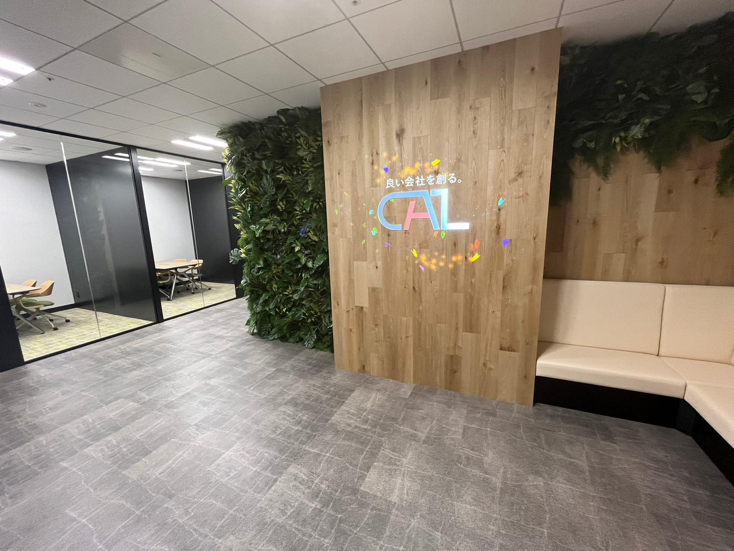 広々としたエントランスには、プロジェクションマッピングを導入し、弊社の代表取締役社長 前田の『良い会社を創る』というメッセージが映し出されています!観葉植物をふんだんに取り入れ、ちょっとしたリフレッシュにも効果的です。