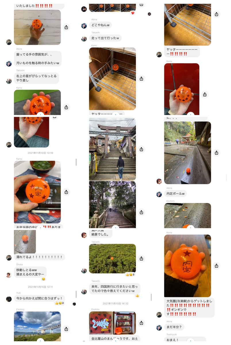 ここからはしばし内定ボール集めに挑むカンウ君の様子を、チームチャットではしゃぐおじさんたちの様子と共にご覧ください。