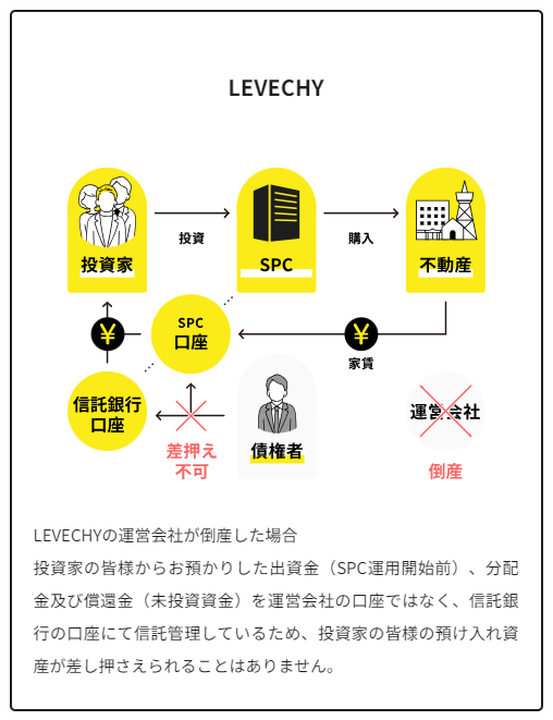 LEVECHYでは、投資家の皆様からお預かりした出資金、分配金及び償還金(未投資資金)を、運営会社の口座ではなく、信託銀行の口座にて信託管理いたします。