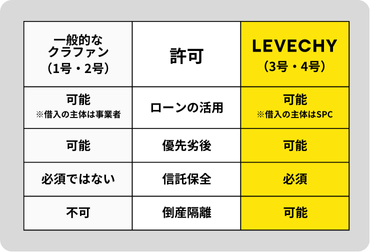 一般的な不動産クラウドファンディングが不動産特定共同事業1号・2号許可事業であるのに対し、LEVECHYは不動産特定共同事業3号・4号事業としての許可を受けています。
