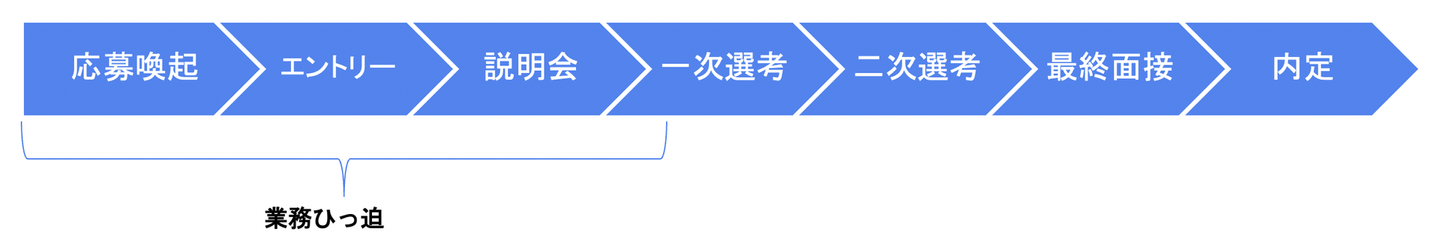 上の図のように、企業における採用活動は就活サイト等での応募喚起から始まり、面接などの選考を経て内定に至ります。