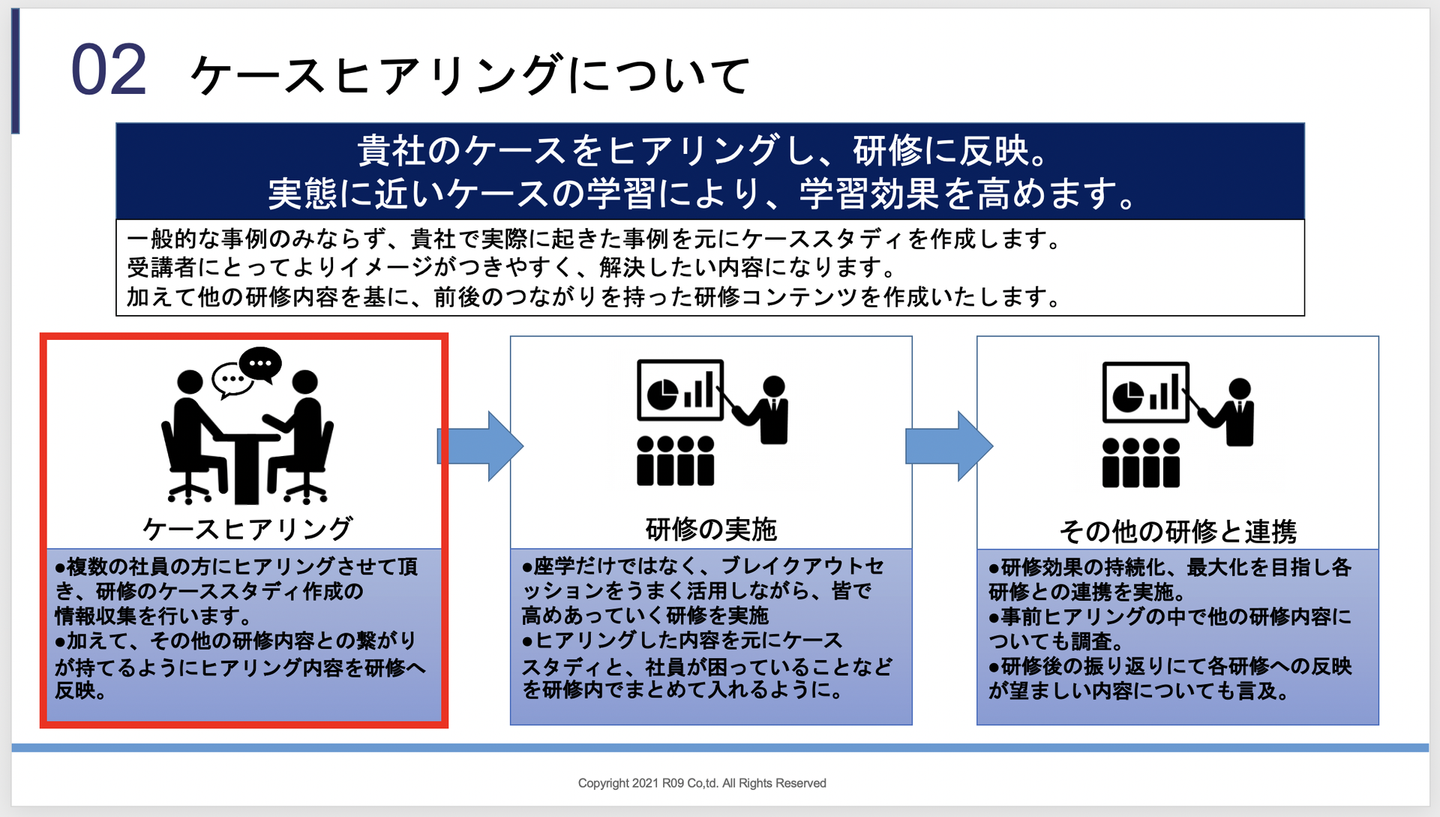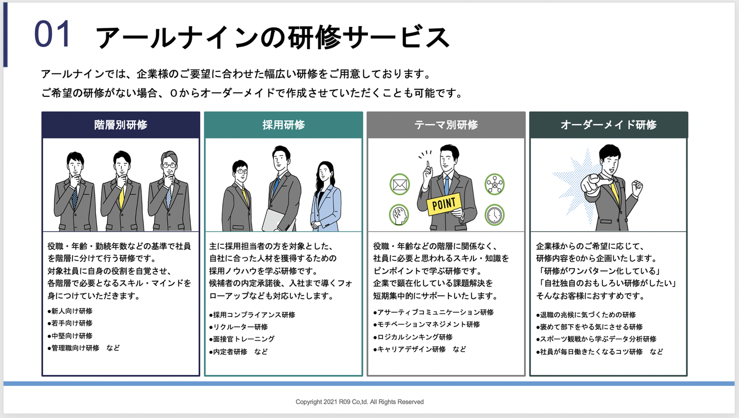 しかしアールナインでは、資料一番右の「オーダーメイド研修」以外でも、その企業に合わせて研修をカスタマイズしているのです!