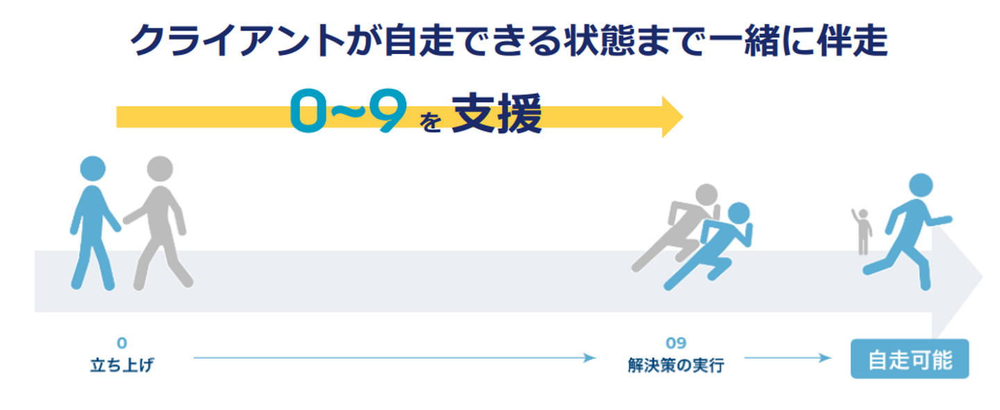 クライアントの課題を解決するためのプロジェクトの立ち上げ(0→1)から、クライアントと一緒に汗を流し、解決策の実行(1→9)まで伴走。