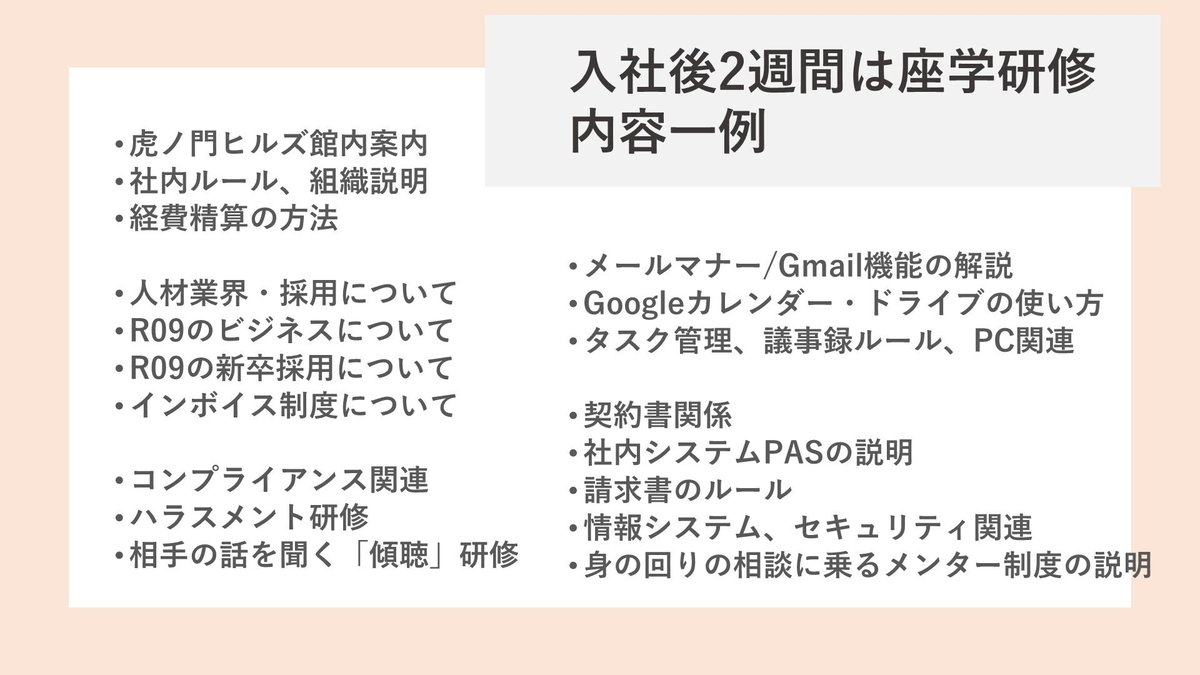 ――中途入社者は、入社後2週間、事業内容の説明、メールの使い方、経費精算の方法など、会社の仕組みについての座学研修を受けた後、OJTに入ります。
