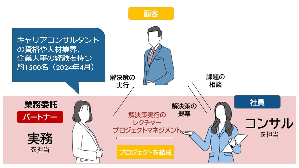 運用ですね。面接代行、説明会代行、エージェントコントロール(採用担当者に代わって人材紹介会社とのやり取りを代行)など色々な商材がありますが、私が代行するのではなく、社外の業務委託パートナー(約1500名)に委託するビジネスモデルです。営業からパスを受けた後、その商材、顧客に合うパートナーさんに業務内容をレクチャーし、委託する。お客様ともやり取りし、プロジェクト全体の指揮を執る。ここの運用はそういう仕事です。