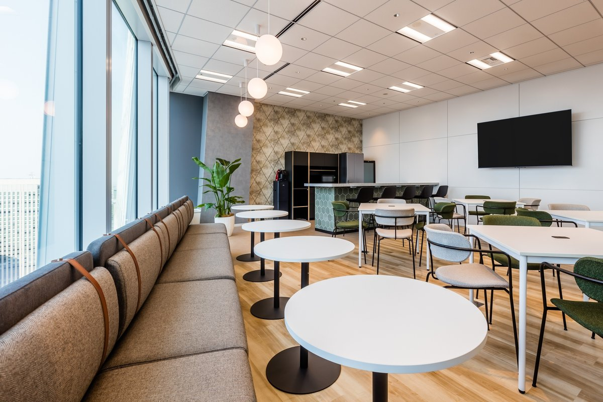アールナインの執務室は席が決まっていないフリーアドレス制で、部署関係なく座る。そのほか、飲み物やお菓子がある「ラウンジ(=写真)」もある
