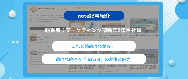 こんにちは!Scene Live人事部長の梶田です。今回は、Scene Liveの主力事業である『lisnavi』の紹介と、お客様に選ばれ続けている魅力について、新卒2年目のマーケティング部の社員がが書いてくれた記事を紹介します。ぜひ、ご一読ください!こんにちは!Scene Live lisnavi事業本部 マーケティング部のかりんです。これまで会社のことやカルチャーについて発信してきましたが、今回は私たちが自社で開発・運用を行っている『lisnavi』について、ご紹介いたします!おかげさまで、『lisnavi』はこれまでに2,600社以上の企業さまに導入いただいています。(2026年1...