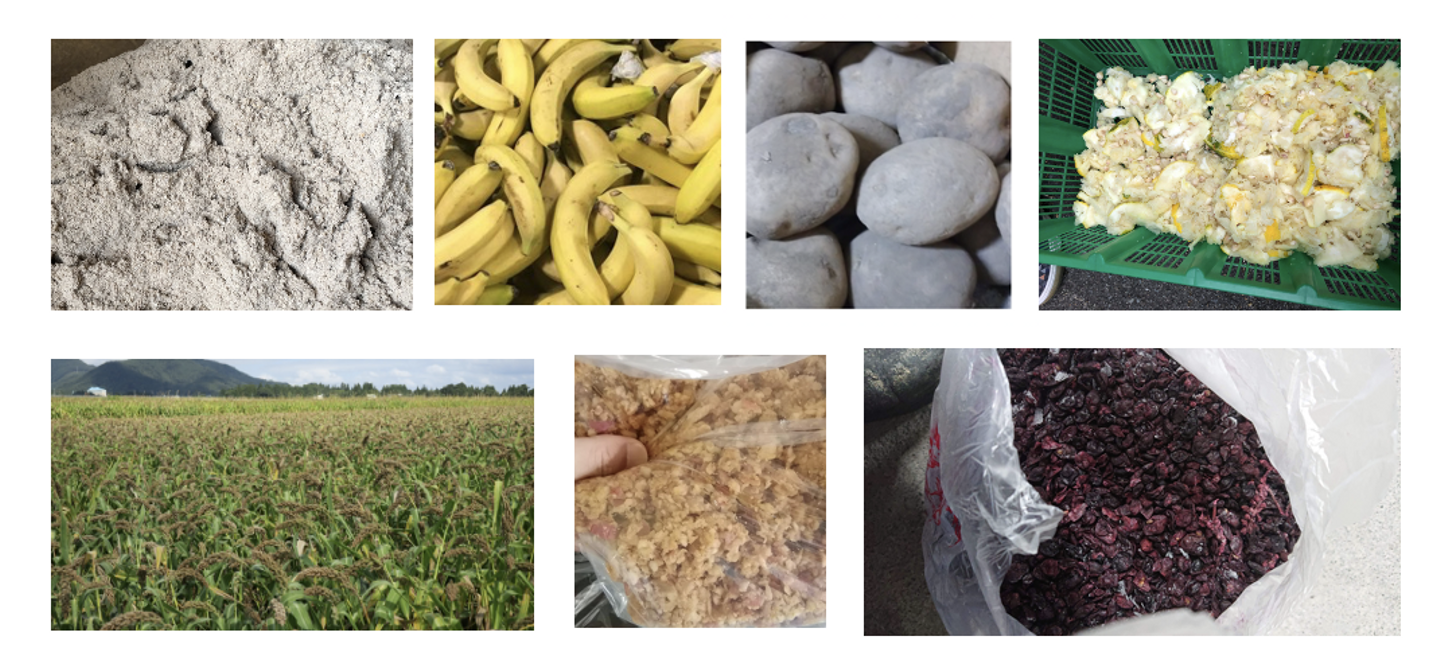 有効活用されていない水田(オーガニックのお米を栽培)、遊休の畑(ひまわりを育てて種から油を抽出)、カフェで出るコーヒー粕、ユズの搾りかす、製造工程で廃棄される飴、流通の過程で出る廃棄バナナ、リンゴのシードルやジュースの搾り粕、ワイン搾りかす、規格外の桃・ぶどう・じゃがいも、研究開発の過程で出る「ごはん」、雑穀のヒエのヌカ。。。などなど。
