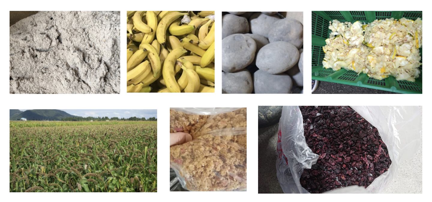 コーヒー粕、ユズの搾りかす、飴、廃棄バナナ、リンゴのシードルやジュースの絞り粕、ワイン搾りかす、規格外の桃・ぶどう・じゃがいも、研究開発の過程で出る「ごはん」など。。。