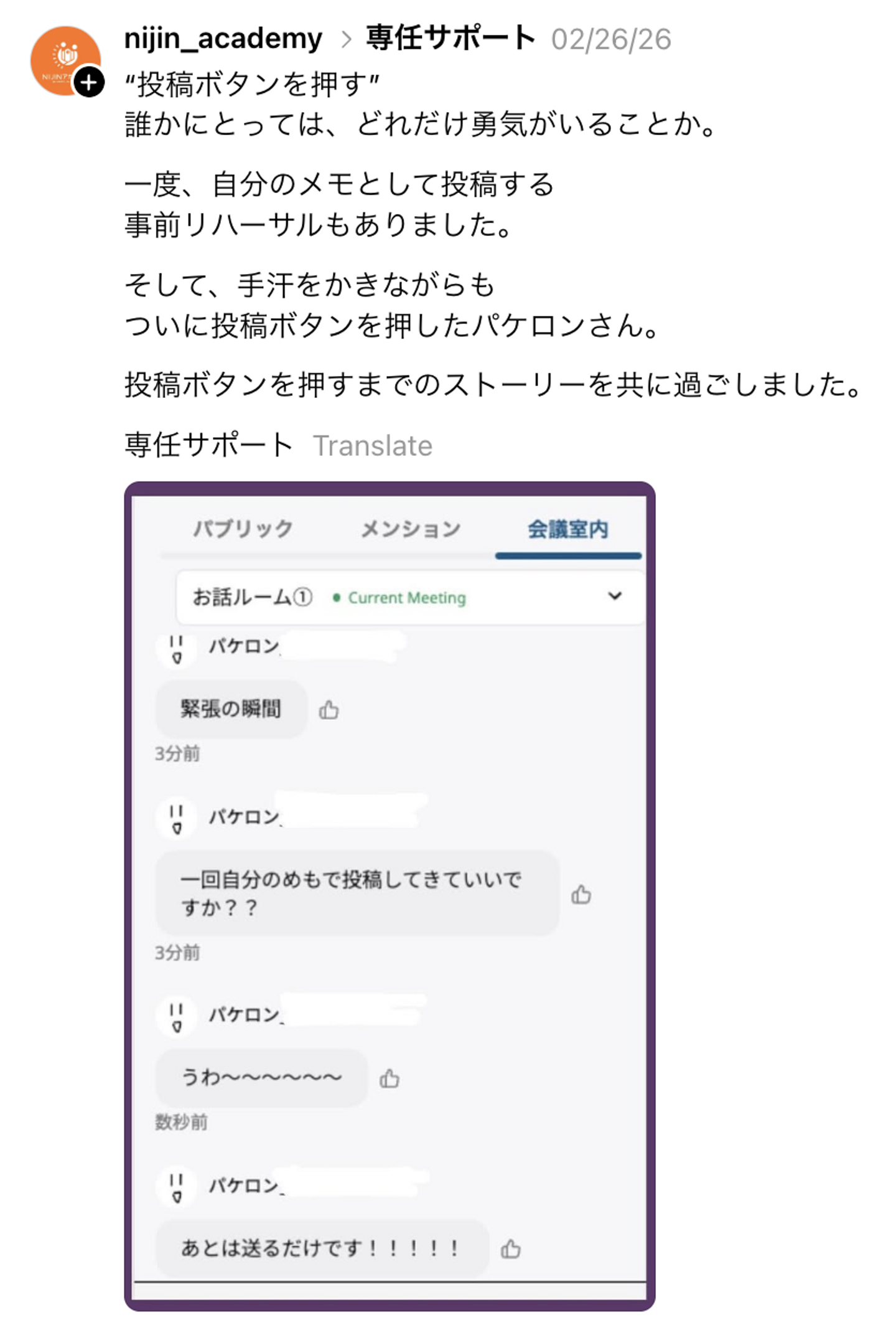 そこで、一緒にSlackで全体に投稿するまでの時間を過ごしました。
