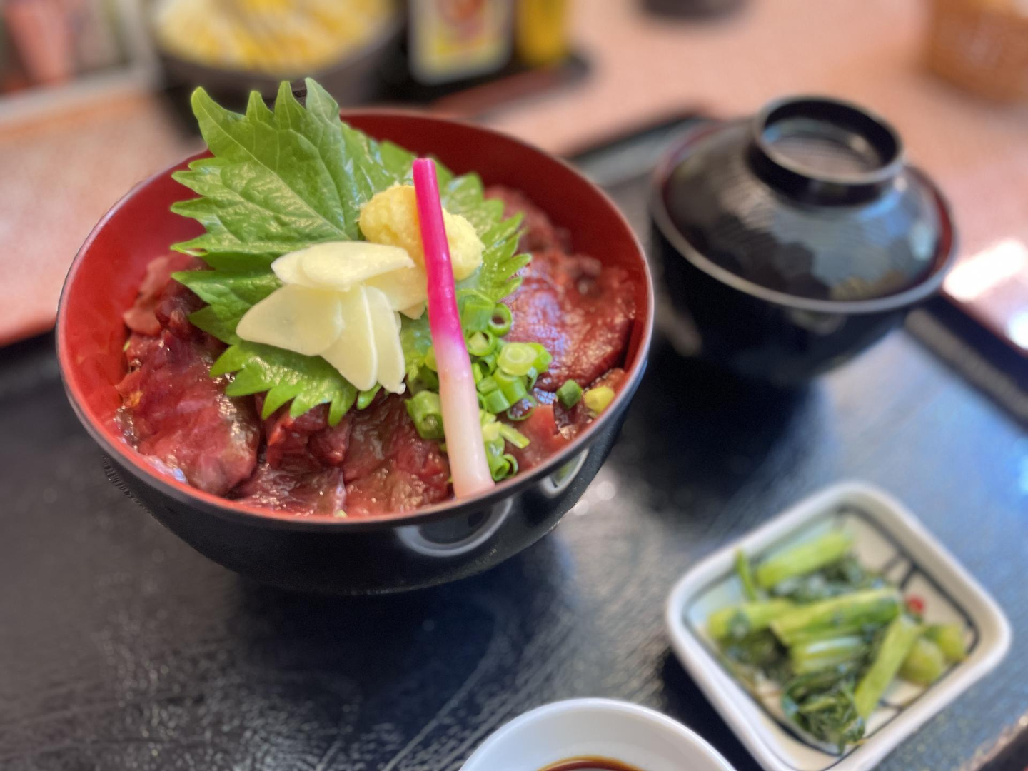丼に使っている馬刺しが非常に美味でした!苦手で普段残しがちなお漬物でさえ美味しくて完食。