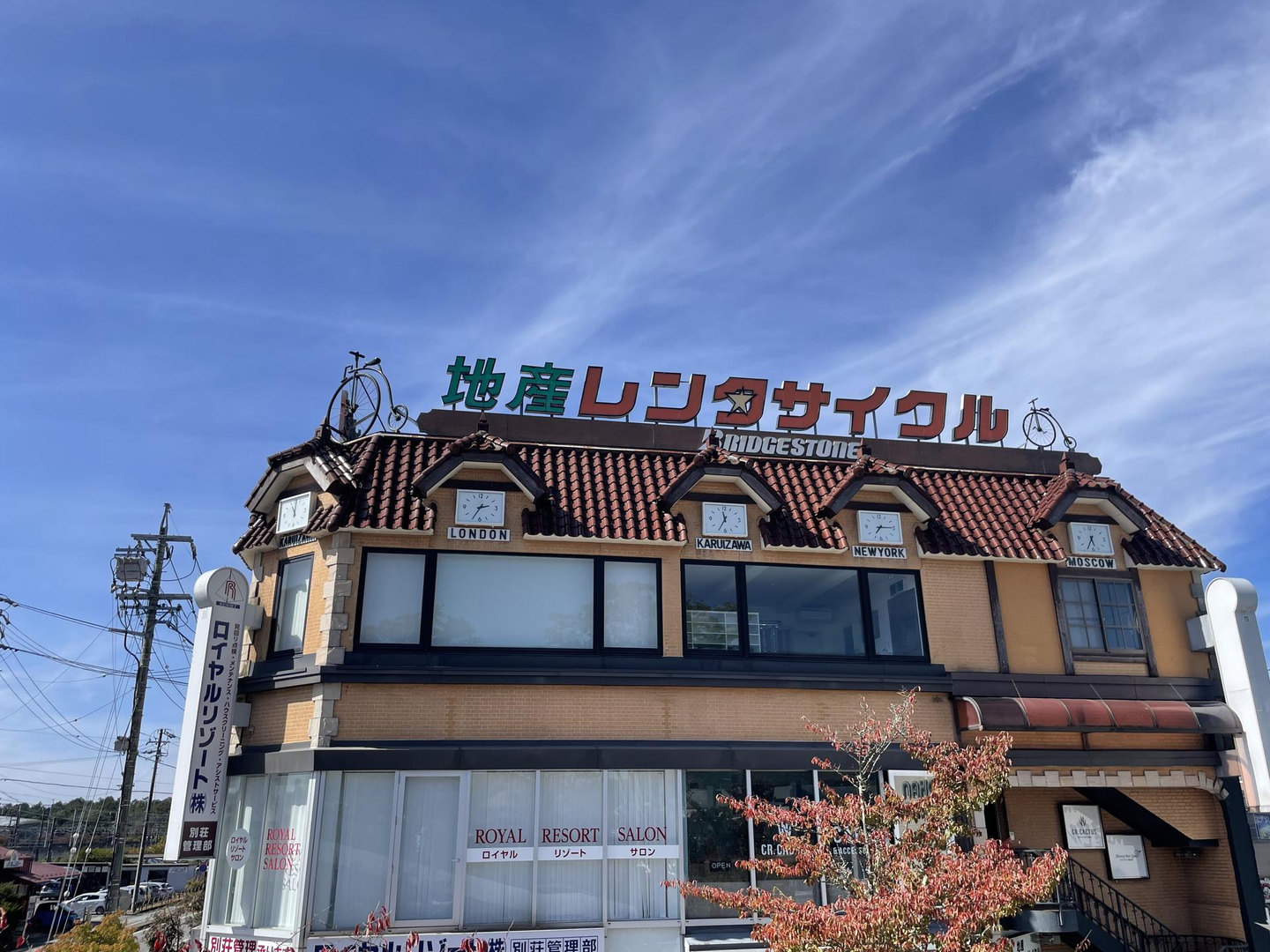 東京などの大きな首都で見る世界の時間がわかる時計は軽井沢にも。レンタサイクル屋さんにこの世界の時計があるのが面白い。