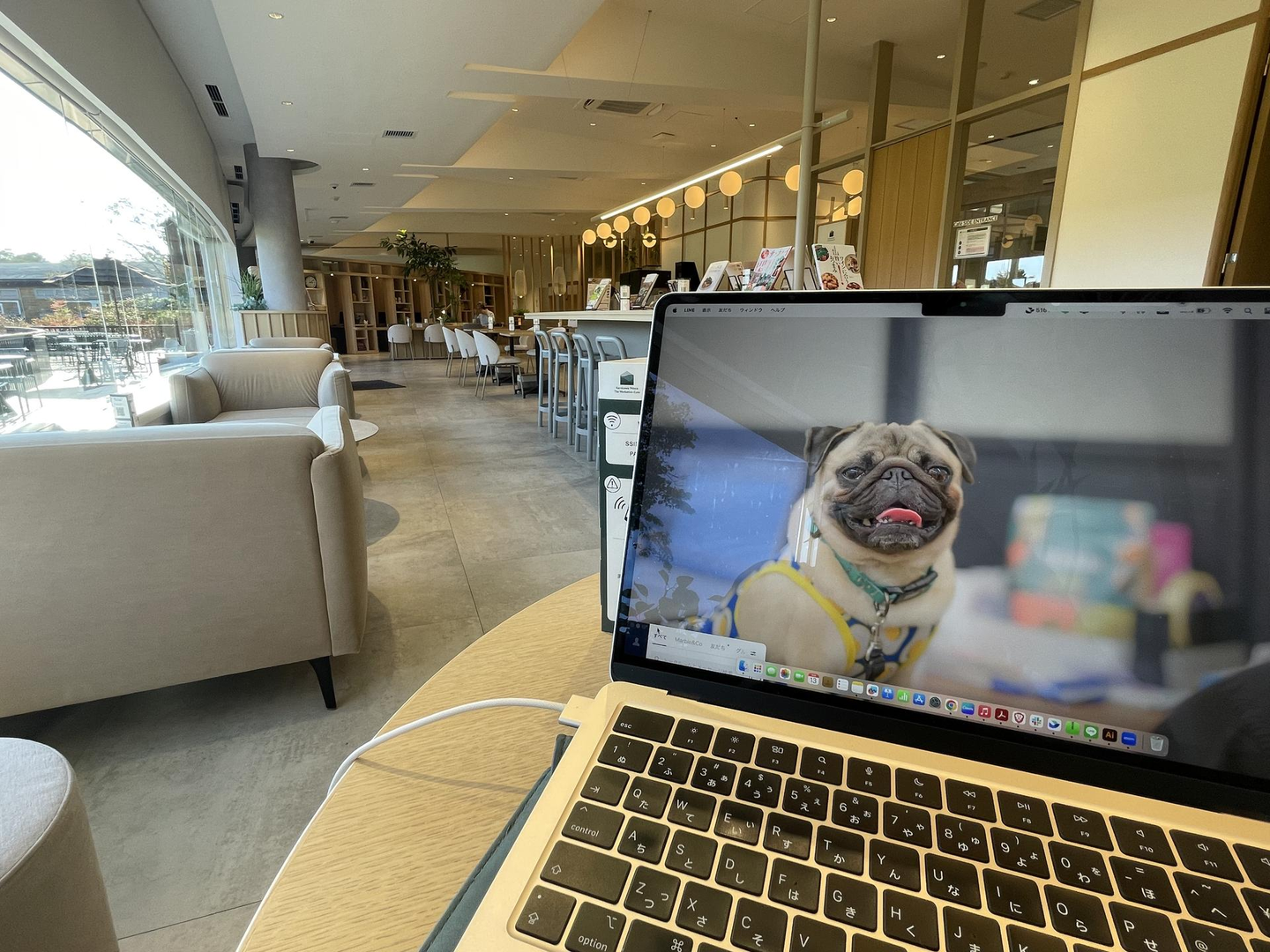 今回はU字型のソファースペースを使用したのですが、ソファの両サイドに電源があるしWi-Fiも使えます。写ってないけど使用できるデスクも広々です。デスクトップは可愛いぱる。