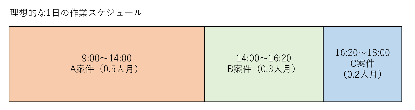 参画中の案件ごとに契約工数が異なるため、1日8時間勤務だとすると以下のように作業時間を区切って勤務することが理想に近い形となります。