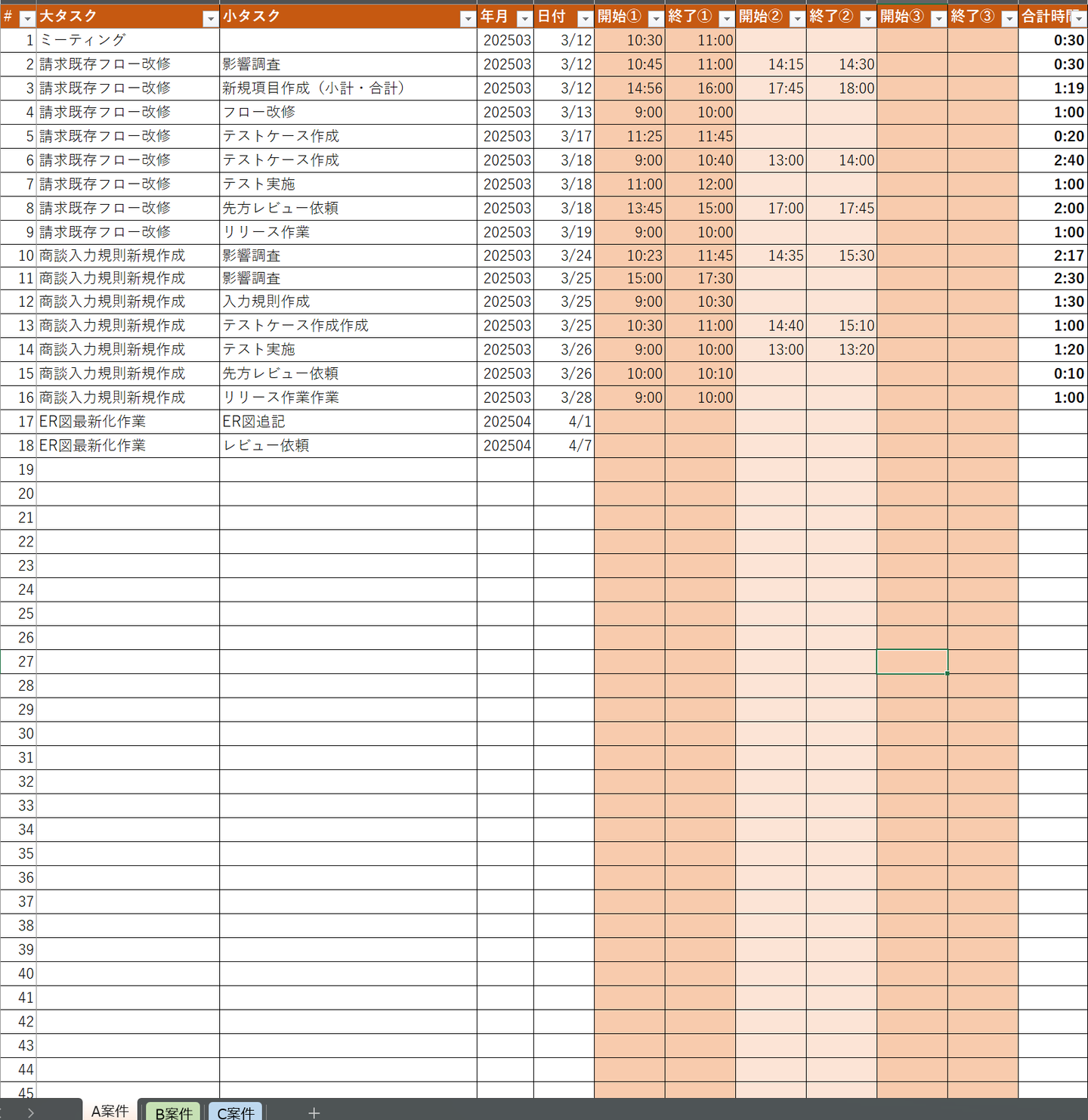 どの作業にどのくらい時間をかけたか、たまによくわからなくなります。。