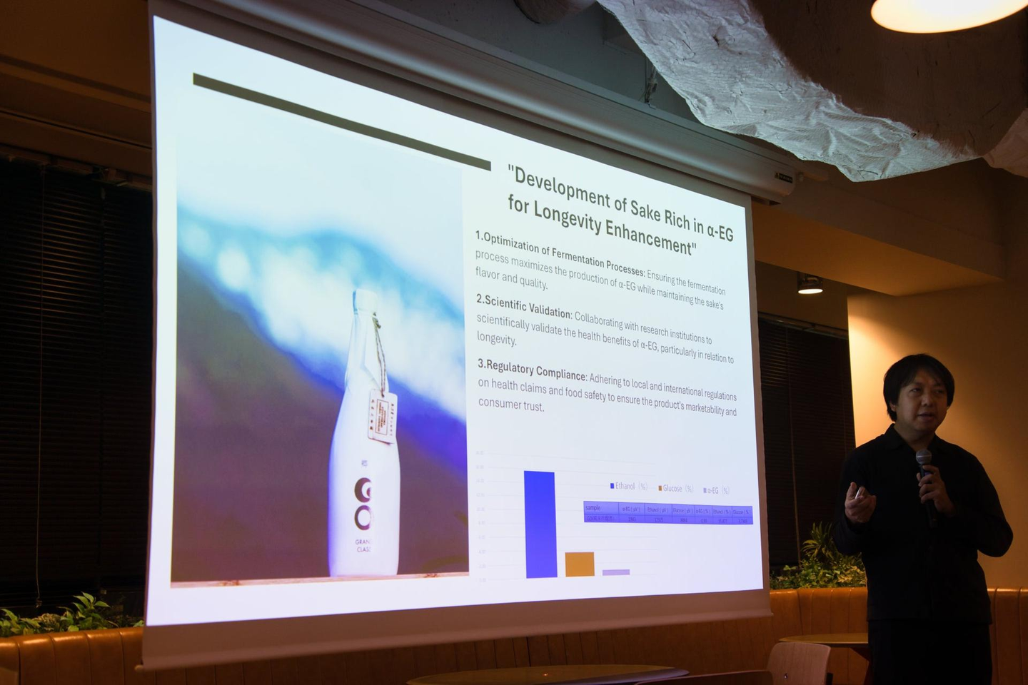 主催の鈴木健吾からもロンジェビティー技術について話題提供を行いました。鈴木はバイオテクノロジーを用いて老化の課題を解決することを目指すリジェネソーム株式会社の代表も務めています。話題提供では日本酒中の成分がロンジェビティに寄与する可能性についても取り上げました。