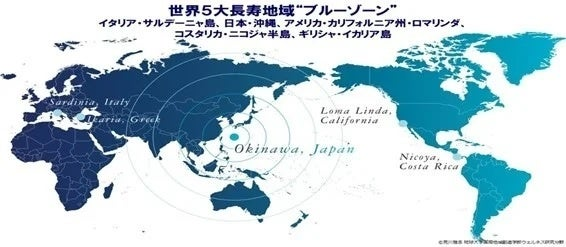 ブルーゾーンとは、100歳以上の方が多く暮らす地域を指し、年齢とともに生じる慢性疾患や障害を防ぎ健康で長生きを実現するためのロンジェビティ研究の対象にもなっています。 長寿地域に共通するライフスタイルや食文化を科学的に解析し、健康寿命の延伸に資する要因を特定する研究対象として、沖縄県はその代表的な地域の一つとして注目されています。