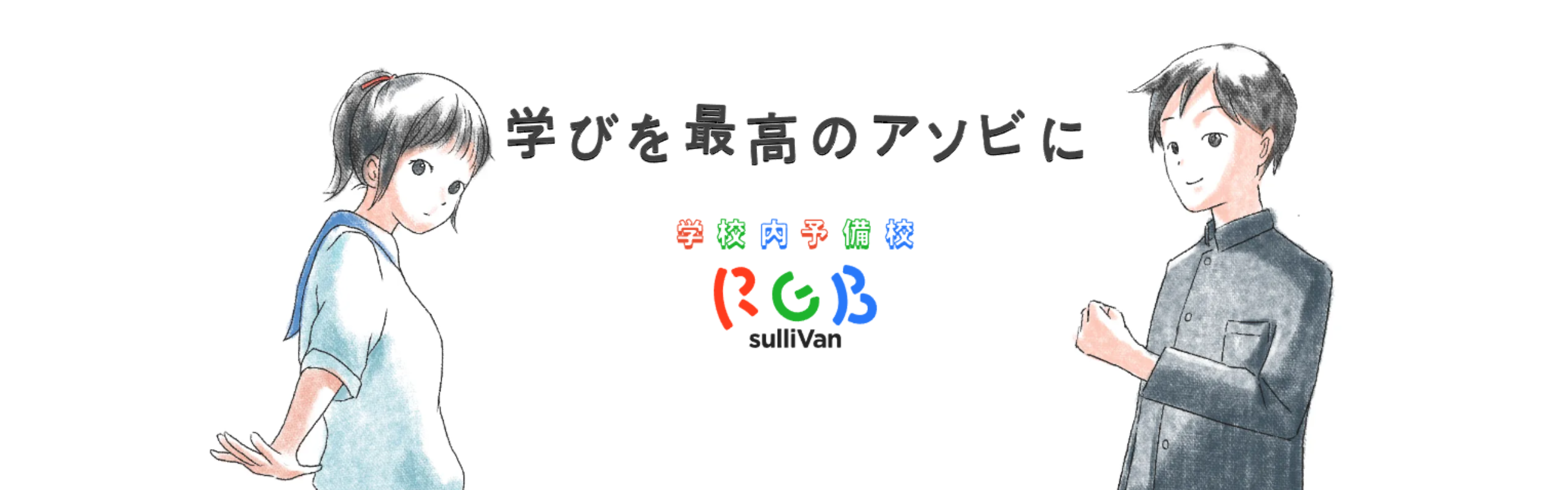 私たちは創業以来、学校内に予備校を開講する「校内予備校」を運営しています。 学校は「様々な行事を通じて人間教育を行う場」、弊社の校内予備校は「大学受験を通じて人間教育を行う場」と考えています。 つまり、弊社は、学校という場所で人間教育と受験指導を融合することで、学力と人間力の向上、そして教育の本質的な目的である「自立(自律)」の実現を目指して企業活動をしています。 「学びが最高のアソビ」になる、やらされる勉強が「やりたい勉強」になる。 その実践とノウハウこそ、RGBサリヴァンの唯一無二の存在価値です。