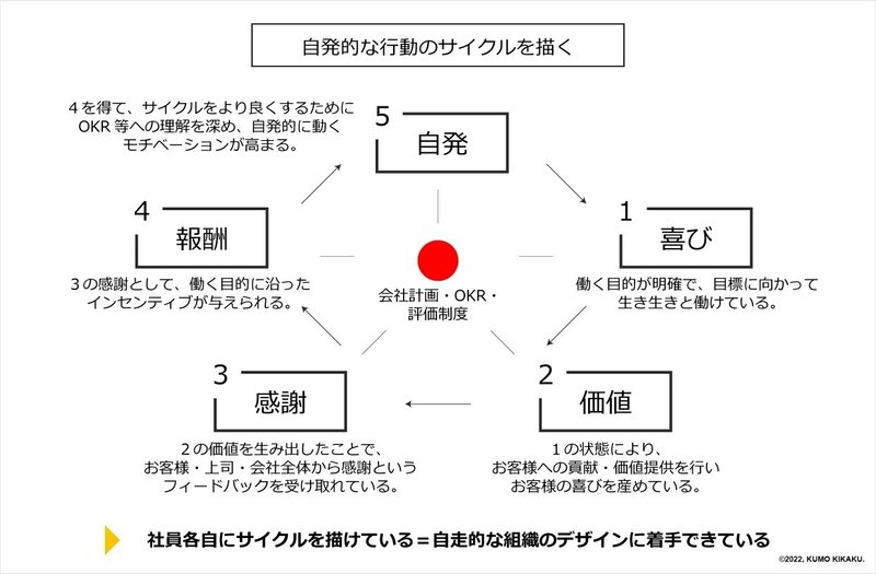1番に「喜び」とあるのは、その社員にとって働く目的が明確で、目標に向かって生き生きと働けている状態をスタートにしているからです。働く目的って一人ひとり違うと思いますが、“Malme(マルメ)”が掲げるバカでかい企業ミッションと、社員個人の価値観が重なりあう部分があれば、喜んで仕事に向き合える状態って自然と生まれると考えているんです。この状態からより良い仕事ができることで、取り組み姿勢がお客様への「価値」の提供や、業界への貢献に繋がります。その結果、目先のお客様から「感謝」というフィードバックが得られ、会社からは「報酬」というインセンティブが出るわけです。求める報酬は一人ひとり違います。ある人にとってはより多くのお金、ある人にとっては十分な余暇時間、ある人によってはより高みに挑戦するための昇格だったり。いずれにせよ、そこで受け取った報酬をバネにして、1周前ではできなかった、より上位の目的達成と価値提供を目指し、もうひと頑張りしてもらう。これが「自発」という行動です。このサイクルでは、仕事の本質的な側面を表現しているだけだと考えています。自己実現と大層な言葉を使っていますが、これも元来、皆が何かしら内に秘めているある種の願望のようなもので、働き方に制約の多い今の時代は、この願望が見えづらくなっているだけなのではないかと思っています。だからこそ、この願望に向き合い続けられる環境をつくり、人生の重要な一部として、仕事を楽しく取り組んでいくことができると考えていて、“Malme(マルメ)”としてもこのサイクルを意識的に描き続けられるような仕組みや社内制度を整えている最中です。