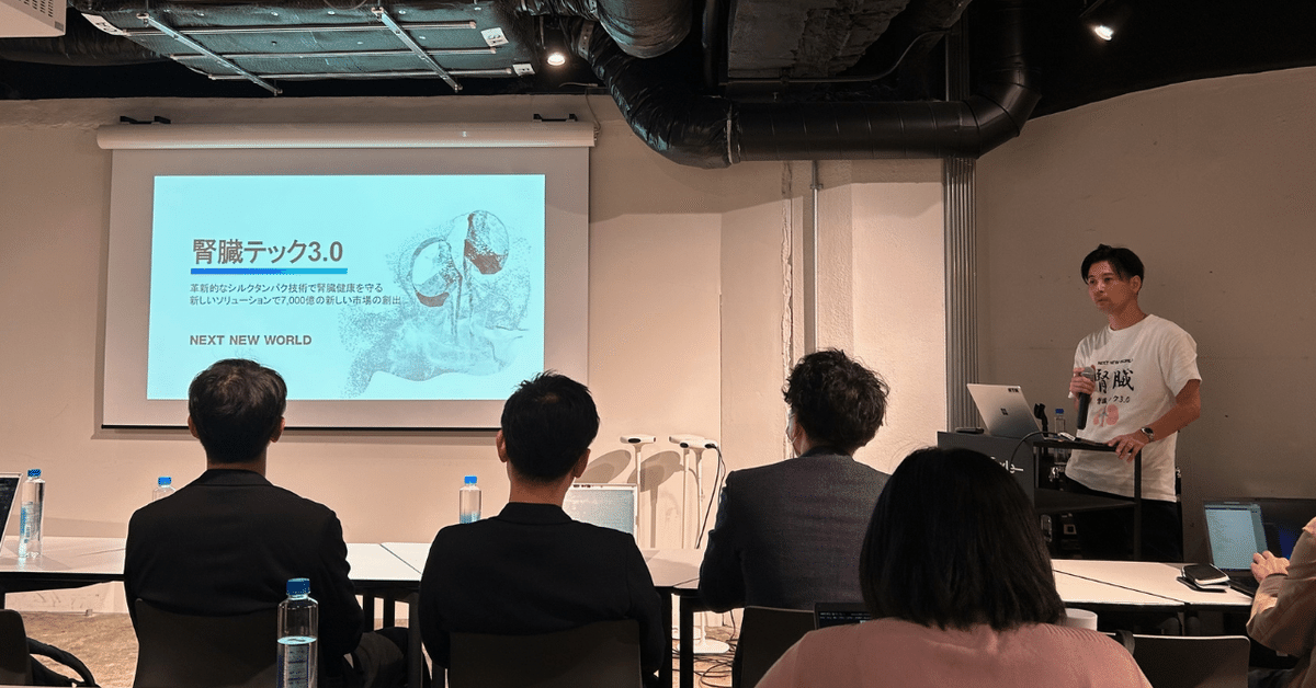 NEXT NEW WORLDは、腎臓病予防を目的としたシルクタンパク質の研究開発を行う日本のスタートアップ。「腎臓テック3.0」との文字が書かれたTシャツをまとった高嶋代表が登壇しました。同社は、シルクタンパク質を活用した革新的なソリューションを通じて、持続可能な社会を実現することを目指すGX(グリーントランスフォーメーション)カンパニーで、シルクを石油や化学原料の代替素材として研究開発し、その生分解性と環境負荷の低さを活かした製品を提案しています。