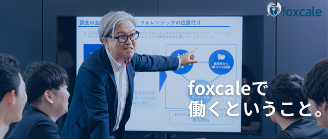 私たち、株式会社foxcale(フォックスケイル)は、リーガルテックを提供するITベンチャーです。デジタルフォレンジック技術を使い、企業のコミュニケーションやドキュメントを収集し、そのビッグデータの中から、不正の重要な証拠を発見したり、企業の問題点を可視化します。 私たちは、不正調査を行う「プロフェッショナル・ファーム」としての側面も持ち、エンジニアと調査メンバーが協力しながら日々不正調査プロジェクトや技術開発を実施行っています。