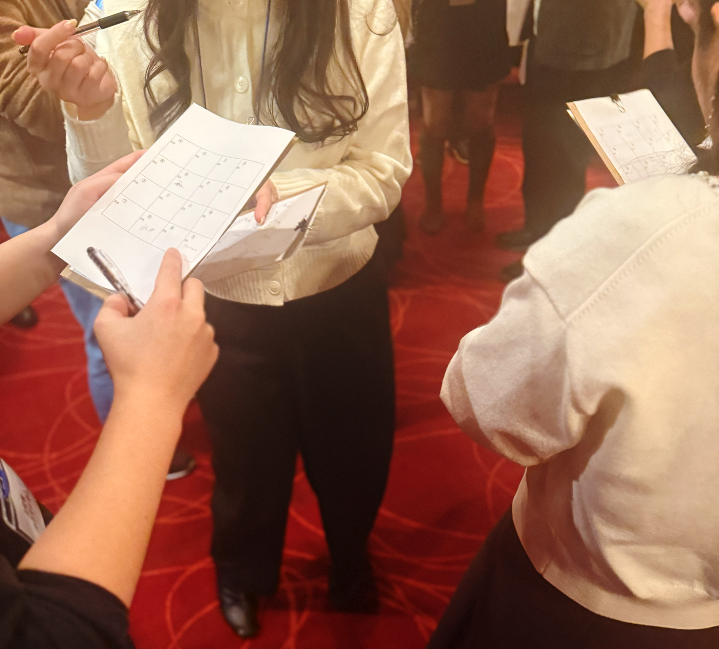 ゲームが開始したら、他チームの人に質問をし、自分と回答が同じ場合に相手に名前を書いてもらう。