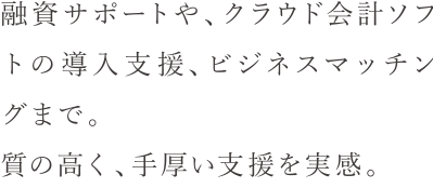 資金調達では、何度も摺り合わせを行い一緒に策定した事業計画をもとに、日本政策金融公庫から希望額満額の融資を受けることができました。また、資本政策や投資契約についてもご助言いただき、複数のエンジェル投資家・企業から第三者割当増資を有利な条件で行うことができました。 経理関係では会計ソフトfreeeの導入から運用まで手厚くサポートいただき、大幅な時間やコストの削減ができました。タイムリーに月次損益が把握できているとともに、決算前検討会を開いていただき、決算の着地見込みや納税予測を適切に行うことができました。司法書士や社会保険労務士、ベンチャーキャピタルの紹介などビジネスマッチングもかなりしてもらっています。