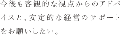 松原先生は、実際に弊社のサービスをご利用いただき、ユーザー目線での意見やアドバイスをくれます。また、定期的に経営アドバイスをいただくことによって経営を安定することが出来ています。これからも弊社の成長に合わせた、的確なアドバイスで、支えていっていただけたらと思っています。