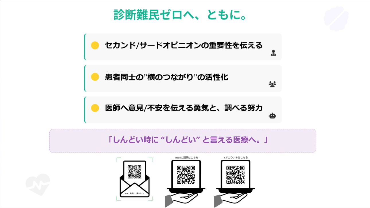 私や難くらさんが経験したような苦しみを、未来の誰にも繰り返させない。難くらさんは情報発信を通じて、私たちは医師を支えることで、同じ未来を目指しています。思いは一つ、同じチームとして、皆で力を合わせて誰も取り残さない医療を目指していきたいです。」