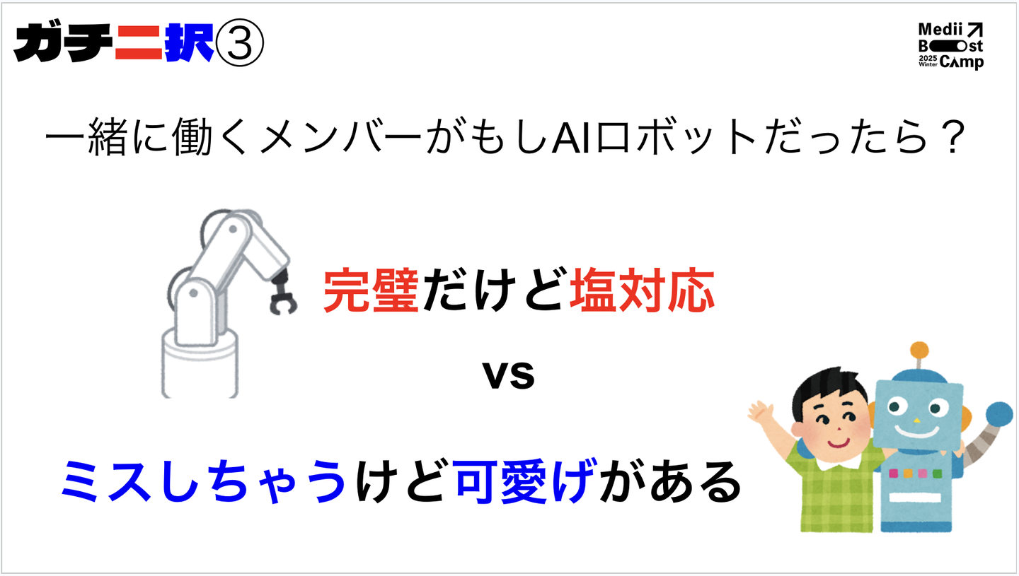 新たな視点や他者との違いを面白がり、相手のストレートな意見を受け入れる素地を作ろうと考えられた企画が、「ガチ二択セッション」です。